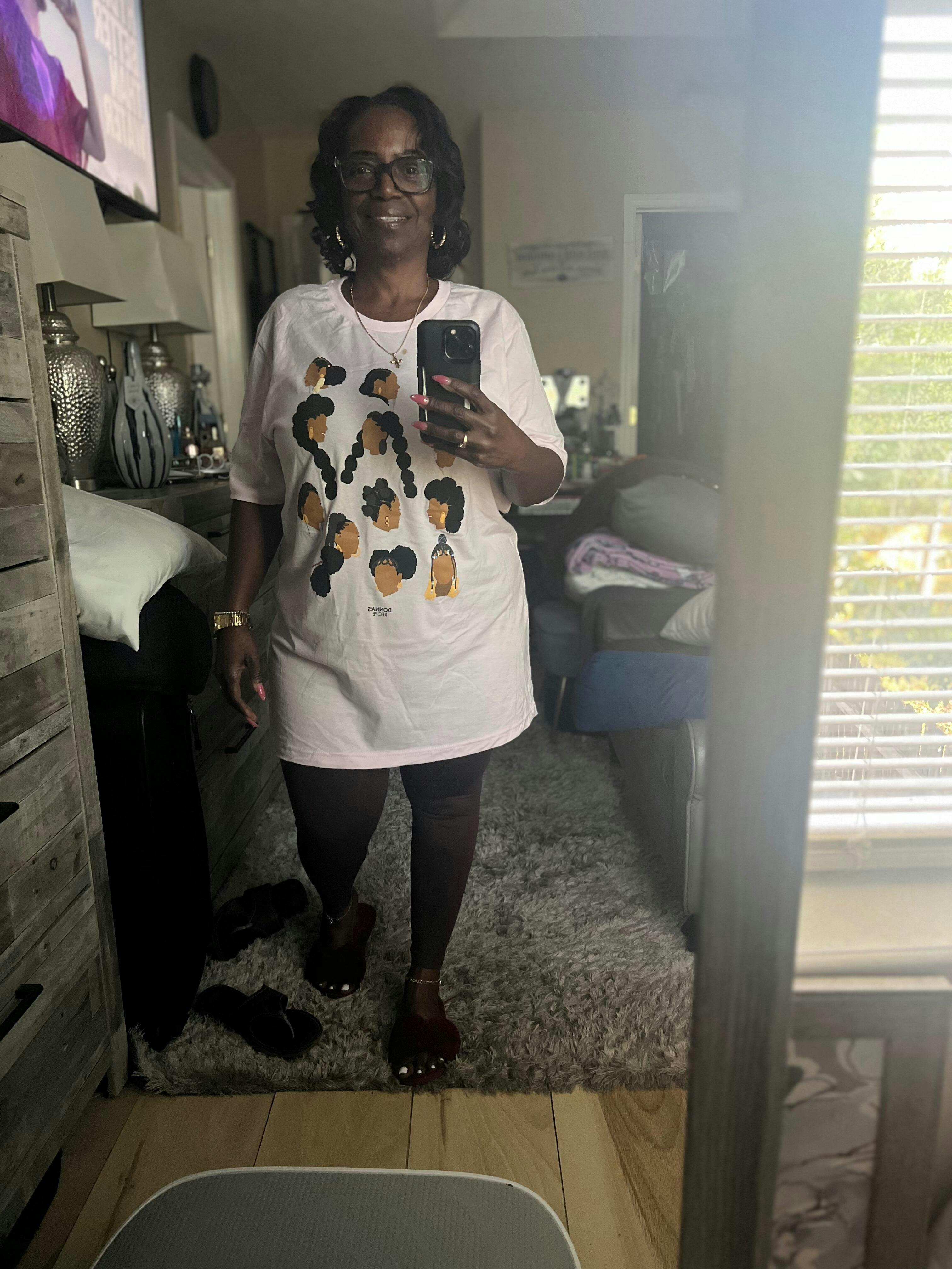 I absolutely love my shirt. Donna always have my curls looking soo amazing, I wore my shirt on my birthday it’s sooo comfy and I love the beautiful representation of Black Hair!!❤️